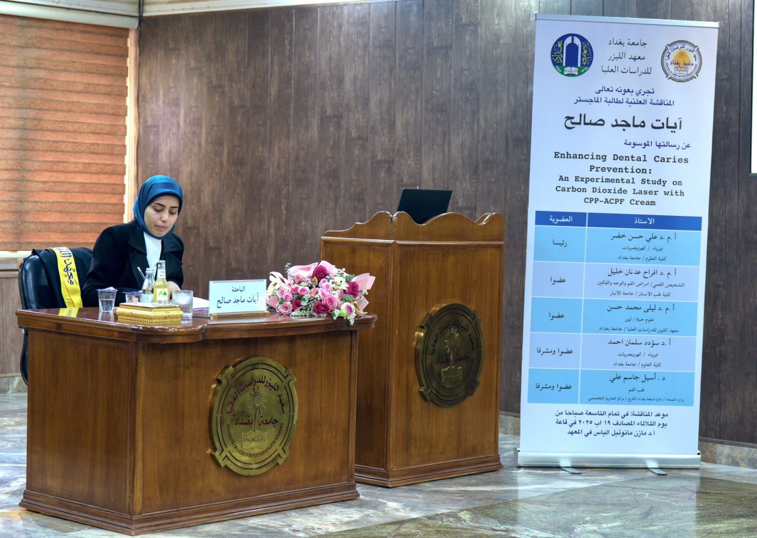 A discussion was held at the Institute of Laser for Postgraduate Studies, University of Baghdad, on the Master’s thesis entitled “Enhancing Dental Caries Prevention: An Experimental Study on Carbon Dioxide Laser with CPP – ACPF Cream” submitted by the student Ayat Majid Saleh, under the supervision of Prof. Dr. Su’dad Salman Ahmed and Dr. Aseel Jasim Ali.