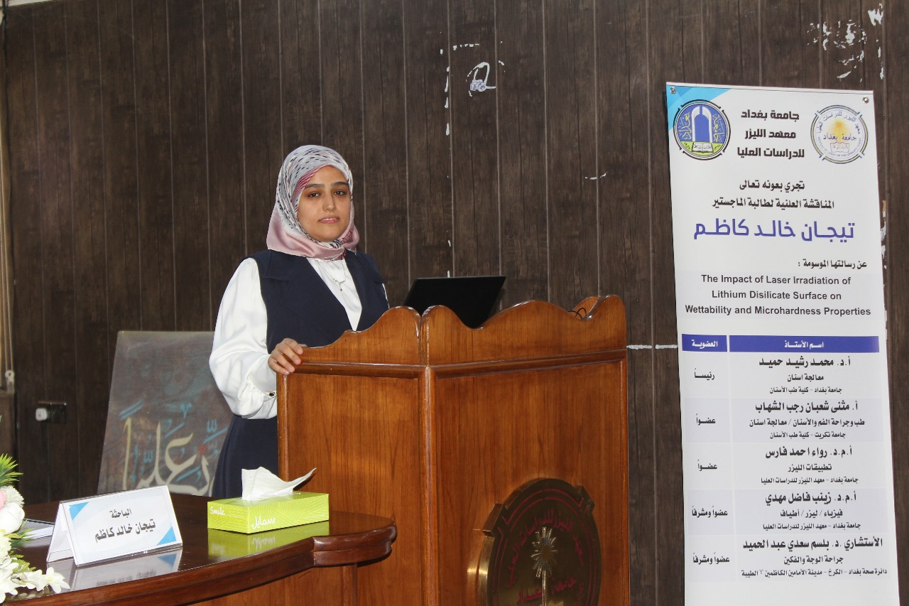 At the Institute of Laser for Postgraduate Studies – University of Baghdad, a Master’s thesis discussion was held for the student Tijan Khalid Kadhum, under the supervision of Asst. Prof. Dr. Zainab Fadhil Mahdi and Dr. Balsam Saadi Abdul Hamid, entitled “The Impact of Laser Irradiation of Lithium Disilicate Surface on Wettability and Microhardness Properties”