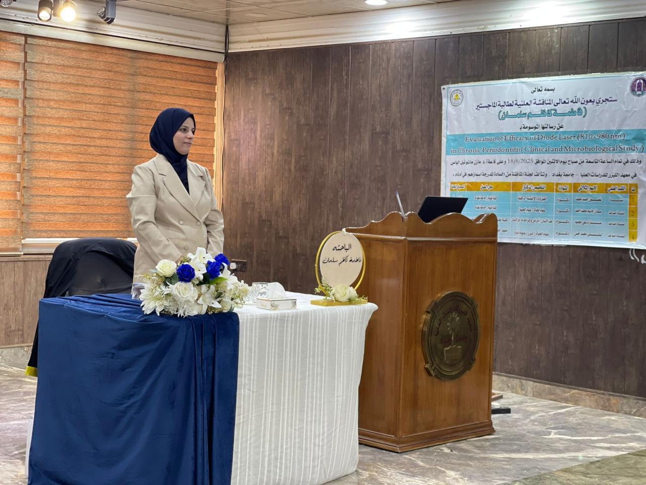 A discussion of the Master’s thesis entitled “Evaluation of the Efficacy of Diode Laser (810 + 980 nm) in Chronic Periodontitis: A Clinical and Microbiological Study” was held at the Institute of Laser for Postgraduate Studies, University of Baghdad, for the student Fatima Kadhum Salman, under the supervision of Asst. Prof. Dr. Layla Mohammad Hassan Al-Amari.