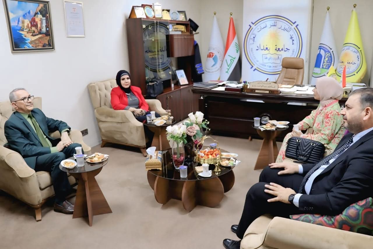 During the meeting, they discussed ways to enhance scientific and academic cooperation between University of Baghdad’s formations, aiming to develop joint research and exchange expertise in specialized fields of common interest, particularly in laser, engineering, and genetic applications. The importance of integration between institutes and colleges in implementing research projects that serve national sustainable development plans was also emphasized, as well as developing the capabilities of students and researchers through joint scientific workshops and seminars.